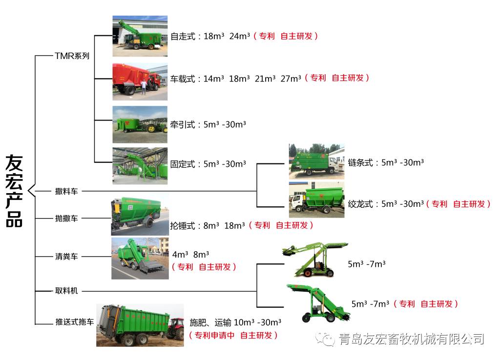 撒料車-清糞車-青島友宏畜牧機械有限公司 青島友宏畜牧機械有限公司成立于2002年7月,是一家集研發、 生產、銷售、服務于一體的高科技企業。現有員工200余人,占地面積50000平方米,年產畜牧機械1000多臺。 公司自成立以來,始終堅持以人為本、誠信立業的經營原則,公司人才結構合理,擁有6位工程師組成的研發團隊,取得專利二十余項。 目前在全國設有8個辦事處,15個配件庫,產品覆蓋全國30余個省份,并遠銷中東、東南亞、東歐等地區。 同時配備了專業的售后服務團隊,可保證在時效內提供售后服務和技術支持。 本公司的主營業務為:1、TMR飼料攪拌機(自走式、車載式、固定式、牽引式、全系5-48m3)2、清糞車(5m3、8m3)3、青貯取料機